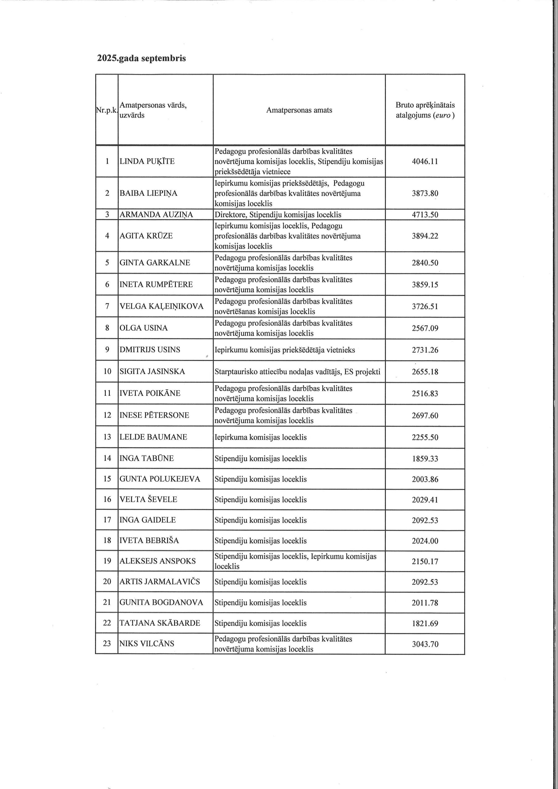 Amatpersonu atalgojuma atskaite 2025. gada septembris