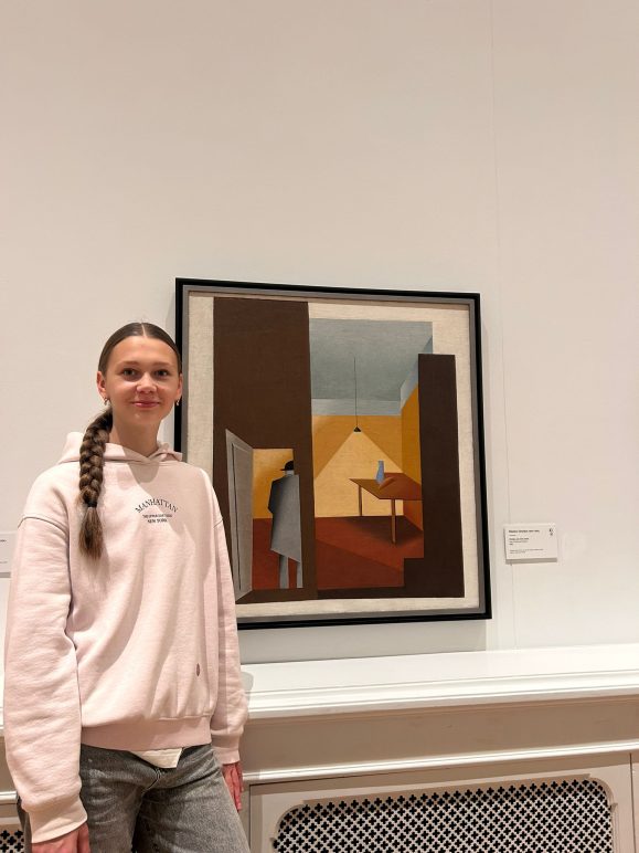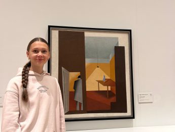 Audzēkne Jete Liepiņa atzina: “Man patīk Niklāva Strunkes “Cilvēks, kas ieiet istabā” mākslas darbs, jo tajā ir interesanta forma un kustība, kas liek domāt, kas notiks tālāk.”